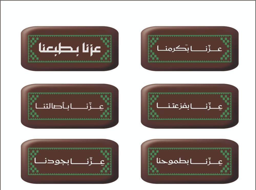 - التصميم: 6 عبارات وطنية مختلفة بإطار مستوحى من فن السدو